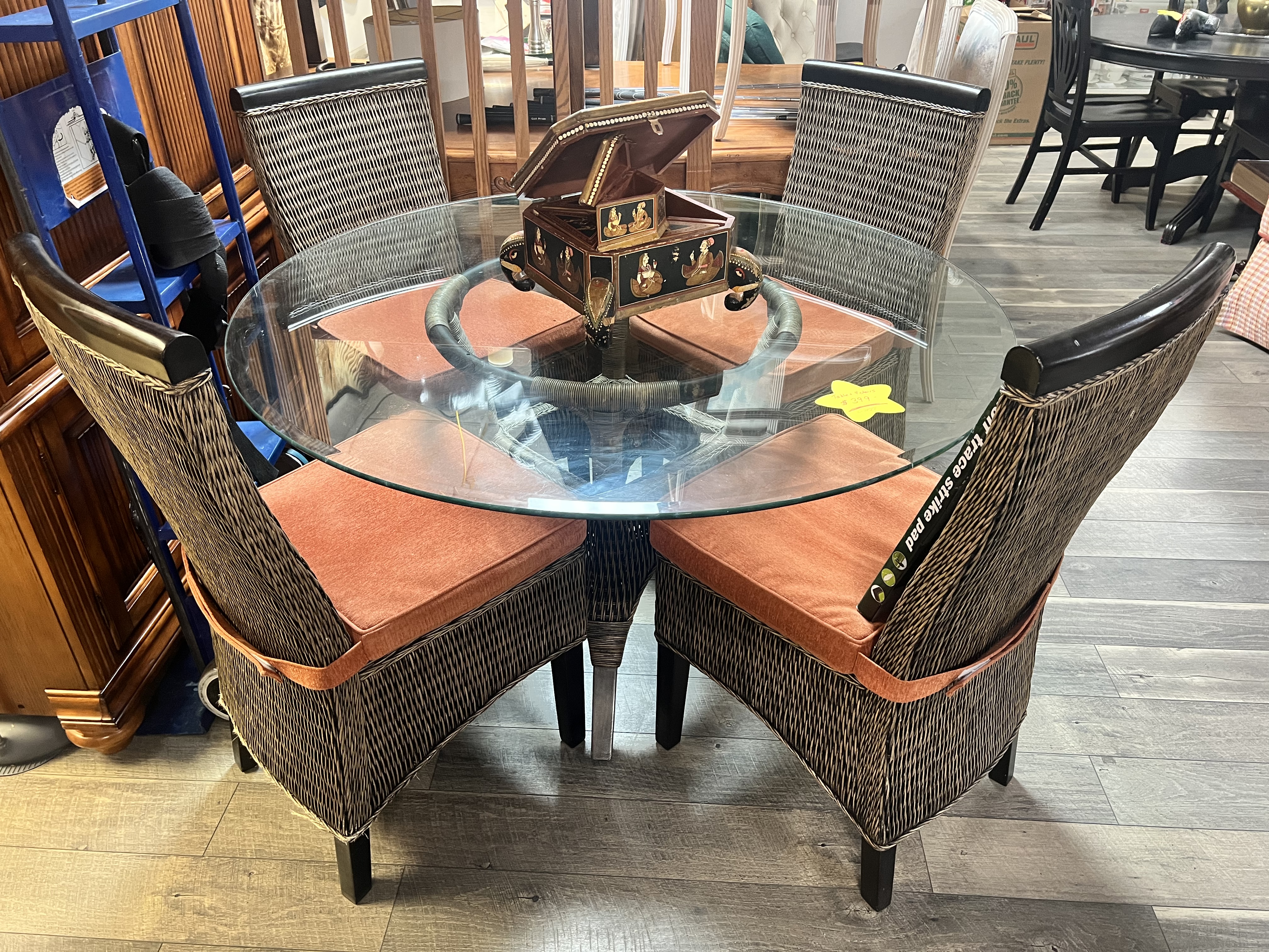 Dark wicker table and 4 chairs. 48’ round glass top.