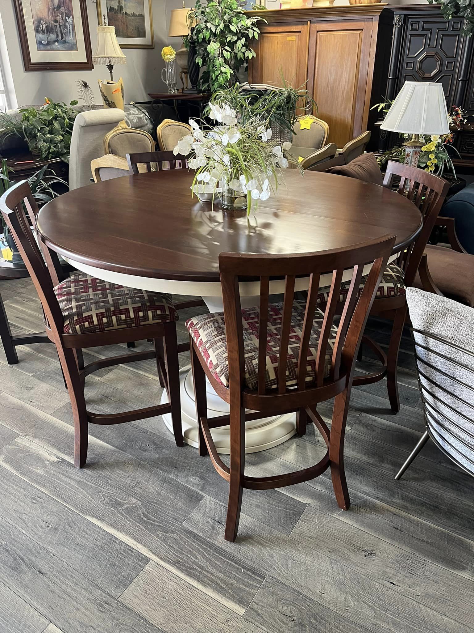 Counter height table and 4 stools. 48’ round with a 12” leaf.